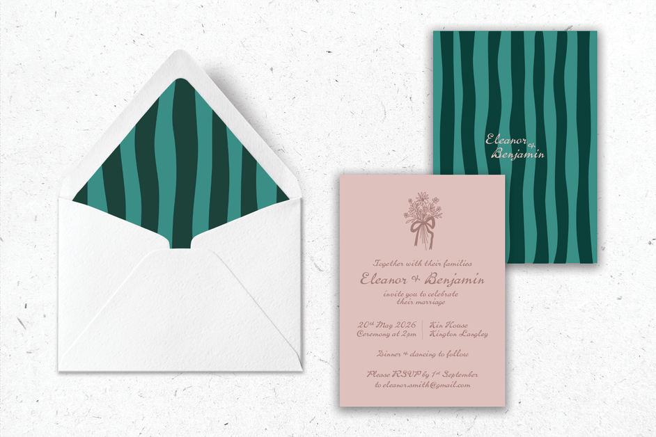 The Iris invites come in A5, printed double-sided on 350gsm silk paper, for a smooth, luxe finish. They are supplied with envelopes with custom liners to match your chosen colour way. Please see price list below for varying quantities.